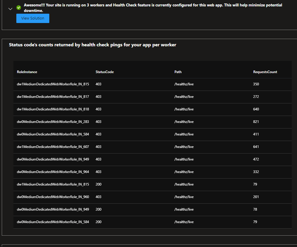 - Should an instance fail to provide a status code falling within the range of 200-299 (inclusive) for 10 consecutive requests, App Service identifies it as unhealthy and eliminates it from the load balancer linked to the Web App. The threshold for the count of failed requests necessary to declare an instance as unhealthy can be configured, with a minimum of two requests.
